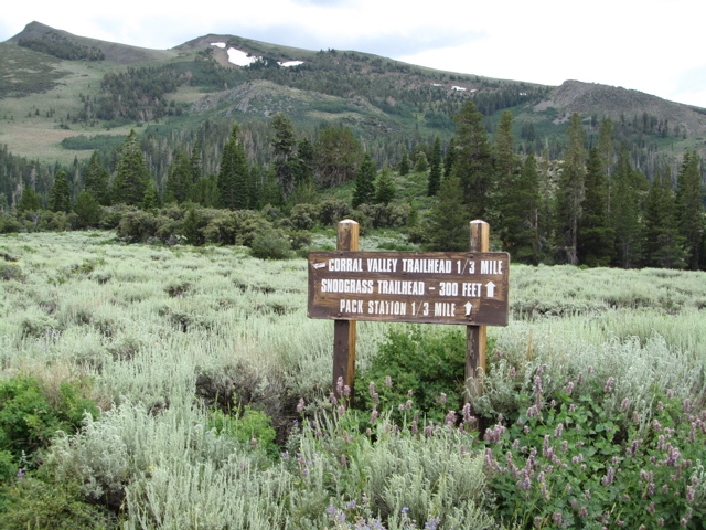 Since we decided to go right at the Rodriguez Flat junction we’re headed for the Snodgrass Creek trailhead and the Pack Station. In about a third of a mile, 6.6 miles from 395, we reach the trailhead. There are wilderness permits at an information kiosk there. The trail follows Snodgrass Creek into the Carson Iceberg Wilderness Area and then intersets the Silver Creek trail that goes up and down stream along Silver King Creek.